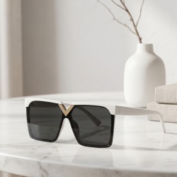 Ξεχωρίστε με αυτά τα εντυπωσιακά γυναικεία oversized γυαλιά ηλίου σε λευκό σκελετό και σκούρους φακούς που δημιουργούν έντονη αντίθεση και κομψό αποτέλεσμα.