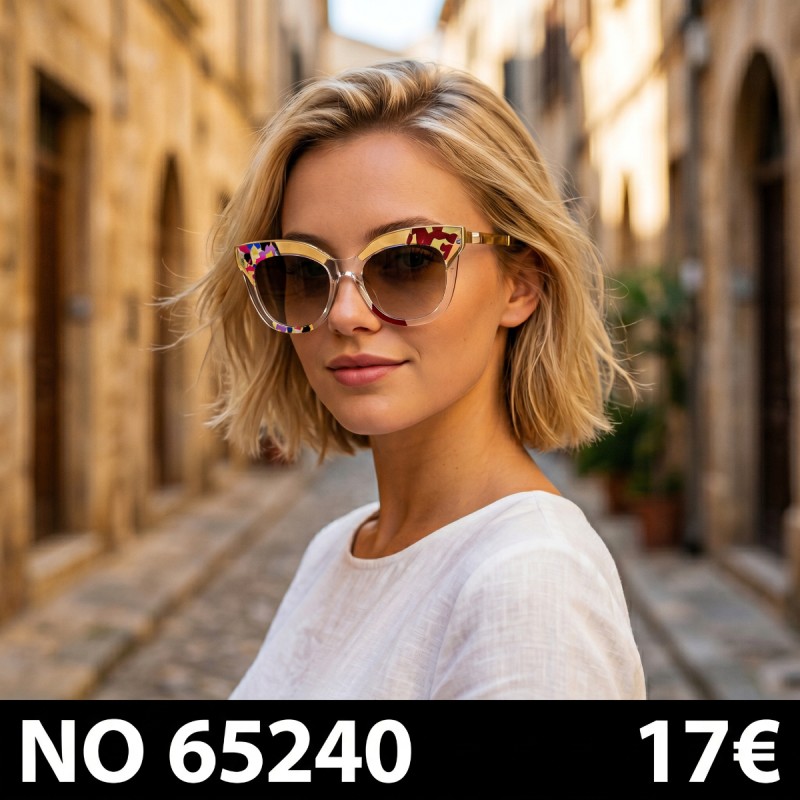 Ανάδειξε τη θηλυκότητα και το στυλ σου με αυτά τα γυναικεία γυαλιά ηλίου cat eye με διάφανο σκελετό και πολύχρωμες λεπτομέρειες.